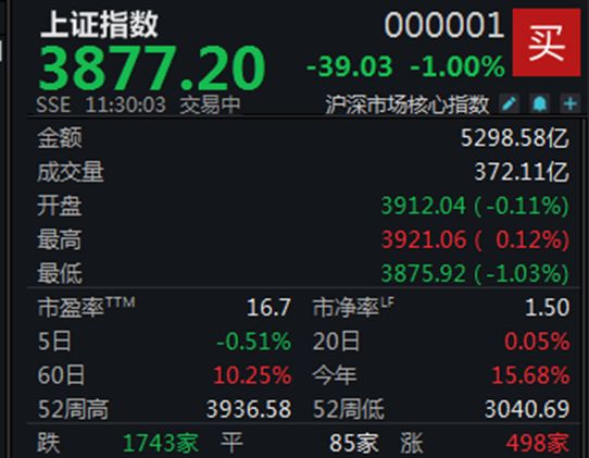 10月17日,大盘低开后震荡下行,双创指数跌幅较大。截至上午收盘,上证指数跌1%报3877.2点,深证成指跌1.99%,创业板指跌2.37%,北证50跌1.81%,科创50跌2.62%,中证A500跌1.5%,A股半日成交1.19万亿元。