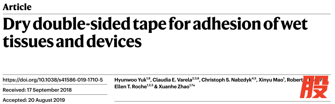 2019年MIT赵选贺团队首创人体双面胶,5秒粘合伤口,相关论文以“Dry double-sided tape for adhesion of wet tissues and devices”为题发表在Nature上,第一作者为Hyunwoo Yuk和Claudia E. Varela。